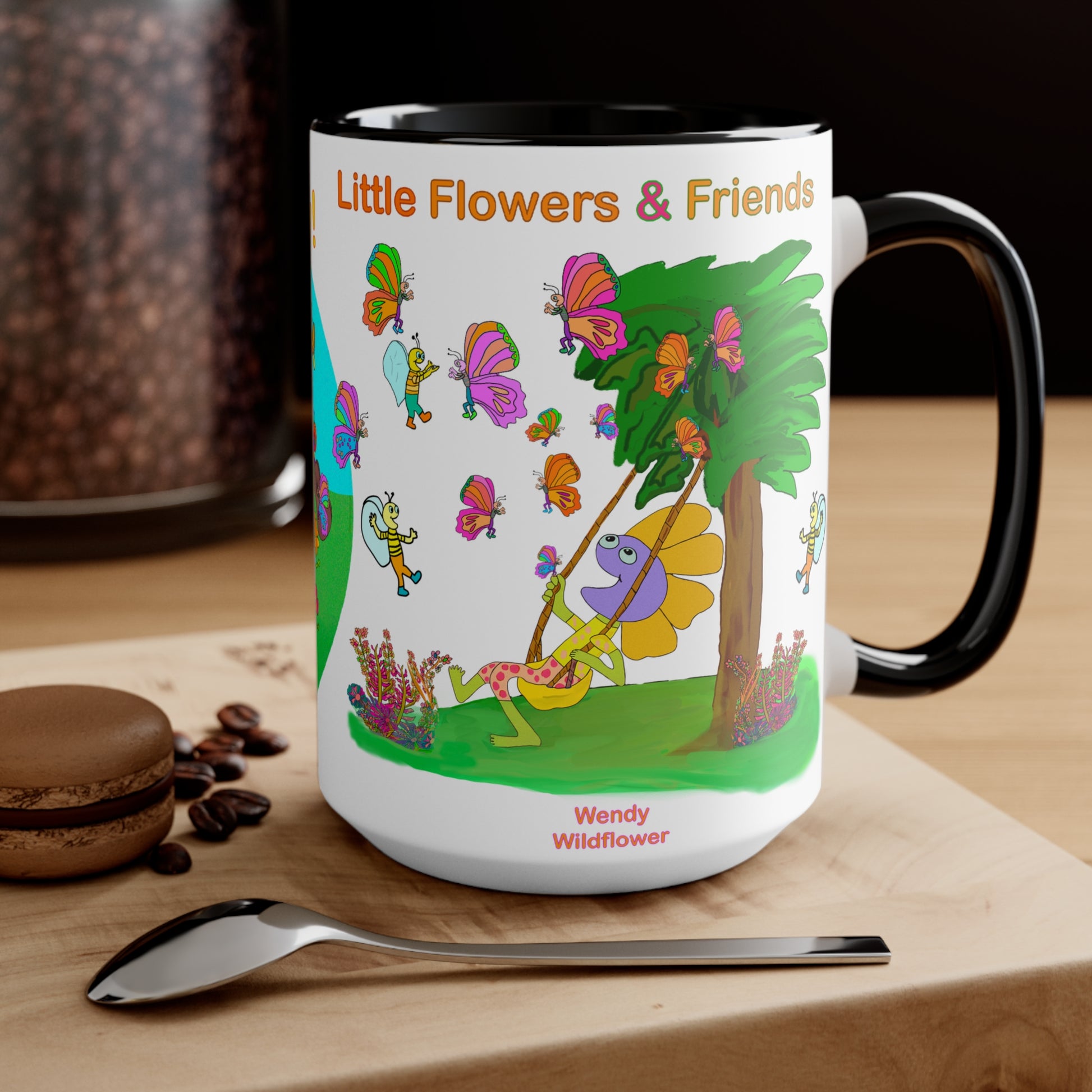 This custom two-tone mug is here to accommodate all your favorite pick-me-up elixirs in style. Its durable ceramic build is microwave & dishwasher safe, 150z, white with black inside.